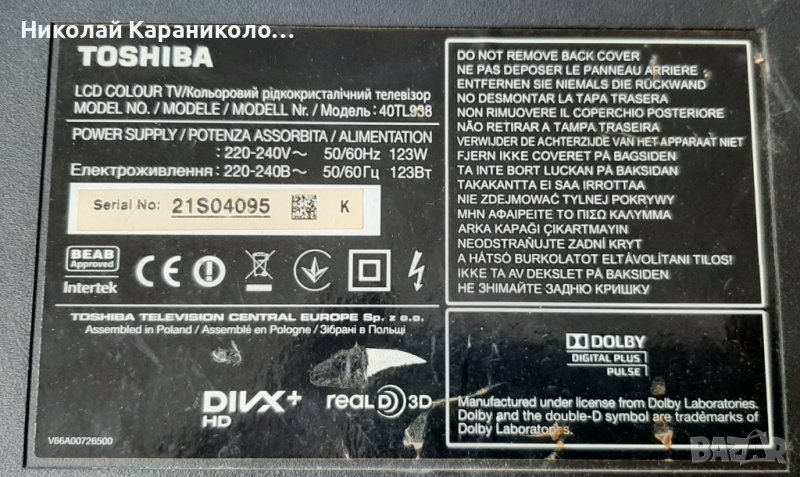 Продавам Power-V71A00022901,Invertor-SSL400_3E1A,T.con-12PSQBC4LV0.0 от тв.TOSHIBA 40TL938 → Обява 40848509