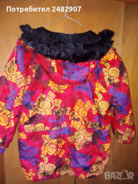 Детско яке за момиче с качулка и два джоба отпред в червено, ръст - 140 см. Ширина в раменете - 50 см, ширина под мишниците - 54 см, дължина от рамото до долу - 88 см, дължина на ръкава от рамото - 45 см. Много запазено, без забележки с регулируеми връзки в долната част, капитонирано отвътре.