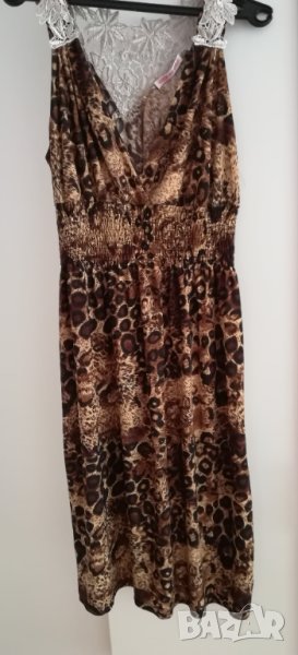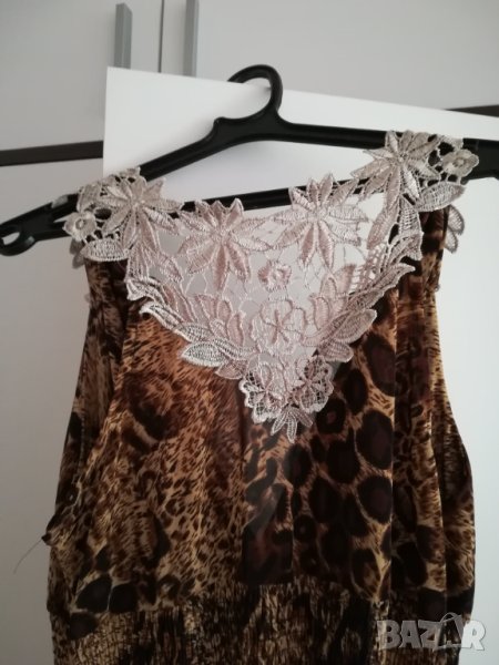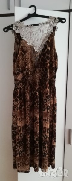 Дамска рокля, без ръкави, леопардов принт, много лека материя, феерична, дантела на гърба и раменете. Дължина 99 см. За гръдна обиколка 100-110 см. защото е разтеглива и с отворено деколте. Обличана само 2-3 пъти. Материя: 95 % полиестер и 5 % спандекс.