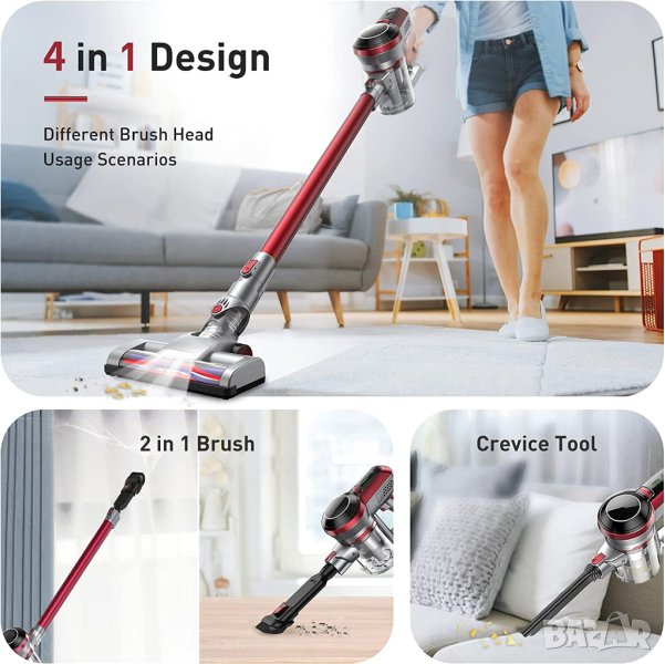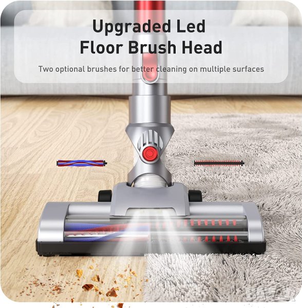- 【Двойна ролкова четка за под и подвижни ролкови четки】 Тази прахосмукачка използва двойна ролка, която няма да надраска пода. Освен това, въртящата се глава на четката и LED светлината могат лесно да почистват дъното на мебели като диван, легло. Предлага се с 2 подвижни четки, за да посрещне различни домакински нужди.