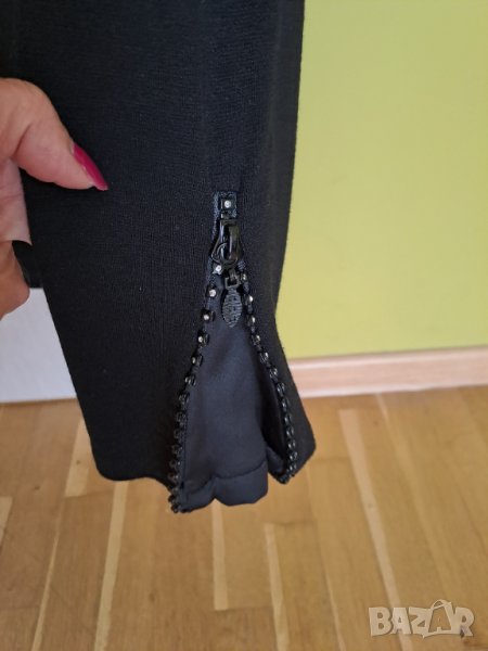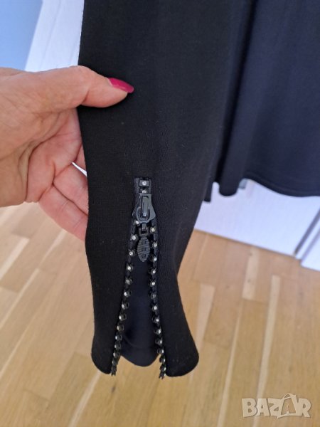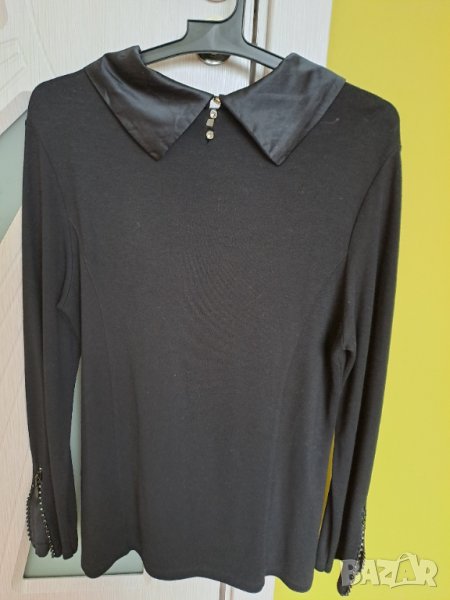 Дамска блуза черно поло с яка Pompoos, отпред яката е леко паднала сатенена, а отзад с 3 блестящи копчета с камъчета. На ръкавите има разтварящ се цип с блестящи камъчета и сатен. Блузата е нова, много интересен бутиков модел. Размер около М /40 европейска/: бюст отпред 48 см /или 96 см обиколка/, талия 46 см /или 92 см обиколка/, дължина 68 см. Отговарям на съобщения тук или тел. 0887780808, изпращам с куриер с отстъпка, преглед и тест, или лично предаване в София.