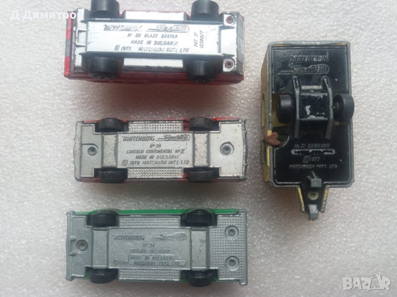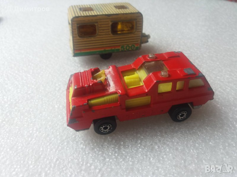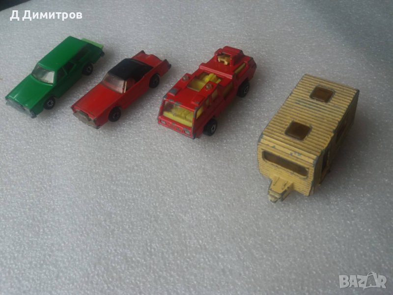 Ретро колички български мачбокс 4 броя. Произведени са между 1975г и 1979г.Пожарната е със счупена стълба и пукнато предно стъкло,караваната е английска от 1977 години.Има драскотини от фулмастер. Другите две са с нормални следи от употреба за годините си.