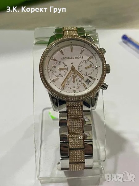 Циферблат: Светъл с розово-златни стрелки, индекси и инкрустирани кристали