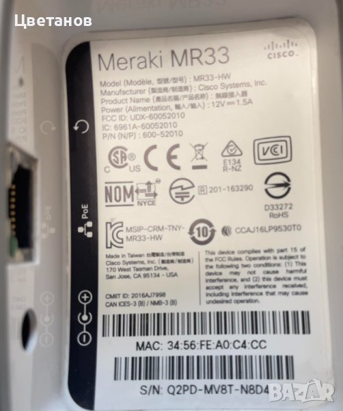 Продавам AP,Cisco''Meraki MR33-HW''.Комплект за монтаж.АП-то е без захранващ адаптер.Работили са около година.Демонтирани са,поради разширяване на системата.Налични 4бр.