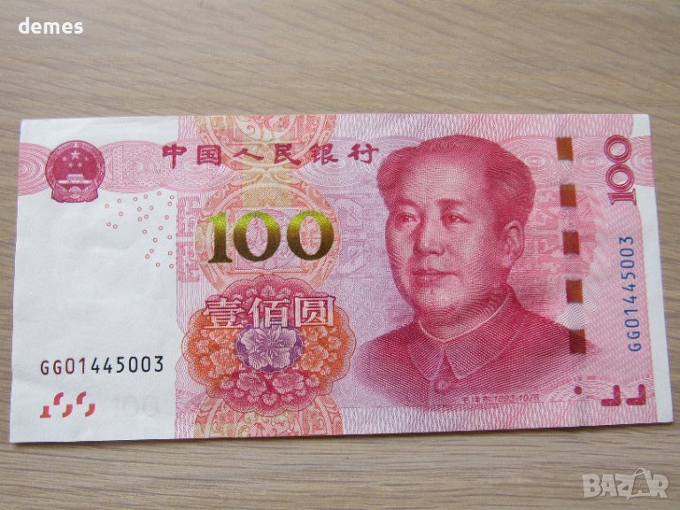 Банкнотата от 100 юана е нова, непрегъвана и неупотребявана.