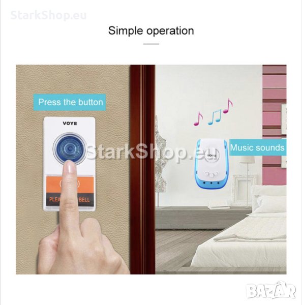 Не е нужно да имате опит или някога да сте инсталирали звънец преди, нито пък е нужно да прокарвате кабели и да пробивате дупки. Захранването е лесно, поставяте батерията (включена в комплекта) на външното тяло (бутон), а вътрешното тяло се включва в захранване на 220 волта.