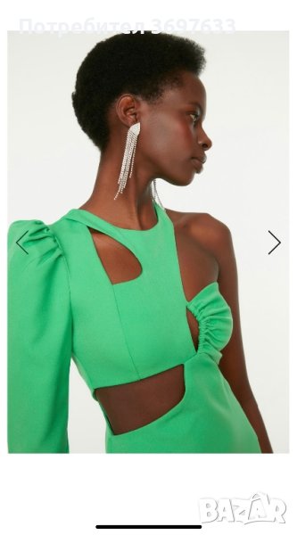 Елегантна,ефектна рокля с буфан ръкав от едната страна и изрязани елементи под бюста.Роклята е обличана веднъж за повод!Размер С