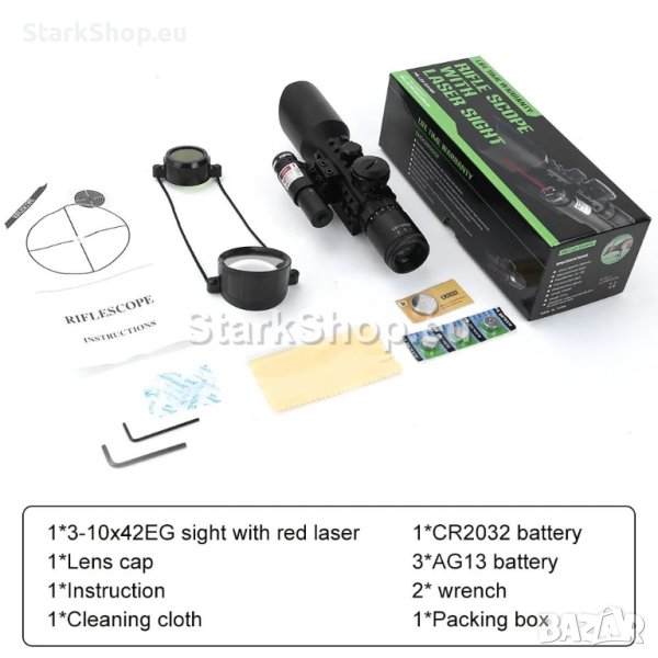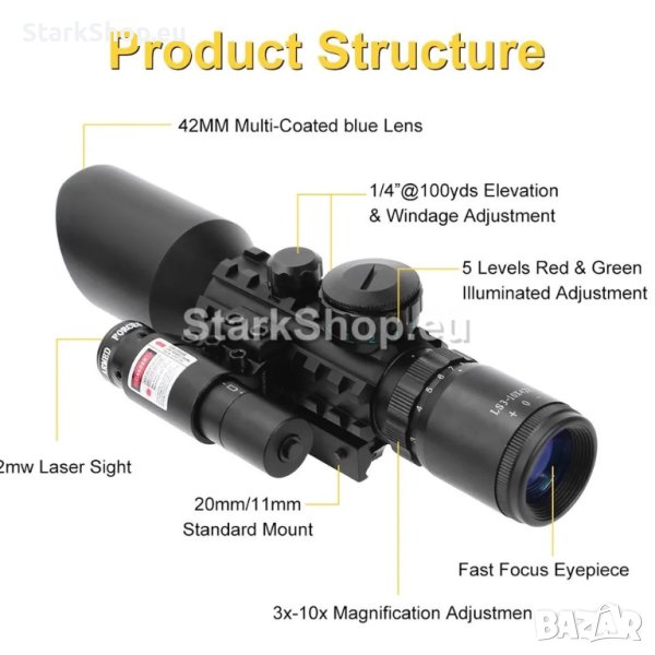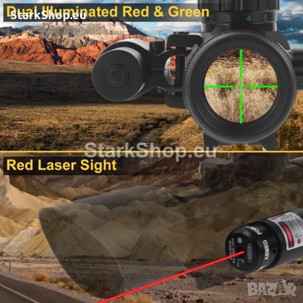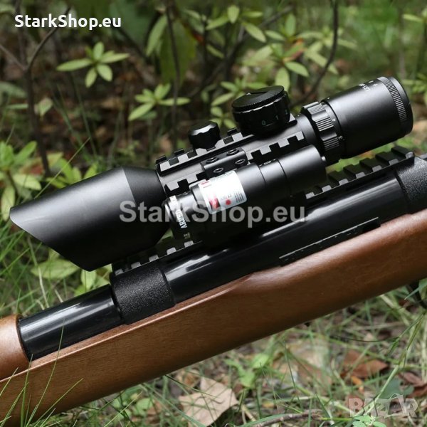 Професионална оптика с лазер за въздушна пушка – бързомерец оптически мерник прицел оптика за оръжие M9 3-10×42 с плавно приближаване и увеличение от 3 до 10 пъти, избор на червен или зелен мерник с регулиране на яркостта и червен лазер бързомер за еърсофт, пистолет, въздушна или ловна пушка.