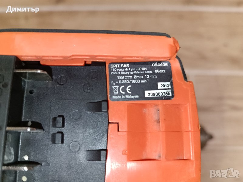 Spit Франция, като модела е напълно иднетичен с Bosch GSR 18 VE-2-LI. Работи с батериите от професионалната серия на Bosch 18V. Добро изправно състояние, има забележки по външния вид, свързани с изтриване на надписите на табелките и гуменото покритие на едно място в горната част. Модела няма ударна функция.