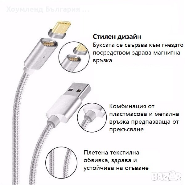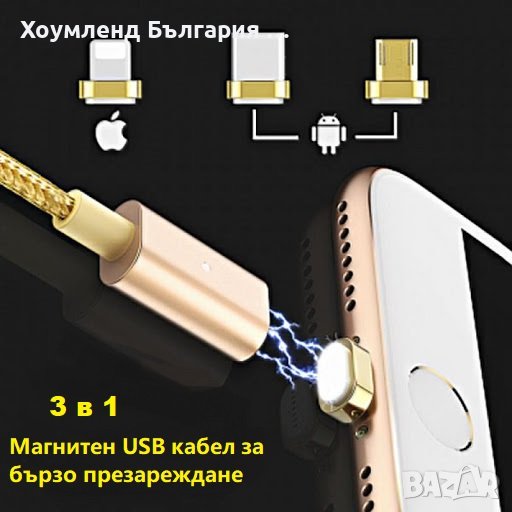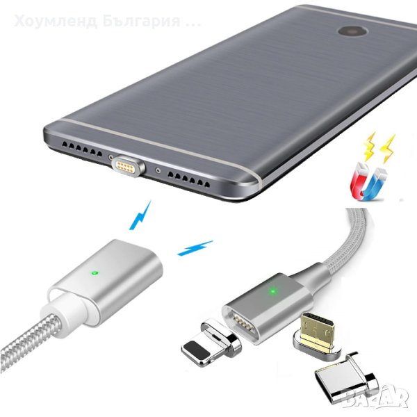 Магнитен USB кабел за телефон за бърз трансфер на данни и зареждане с 3 накрайника.