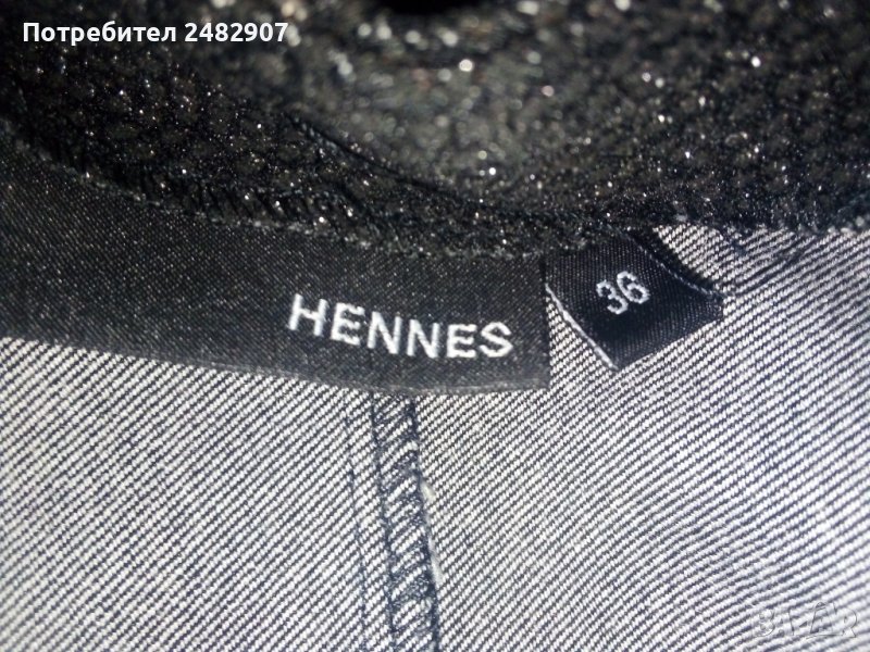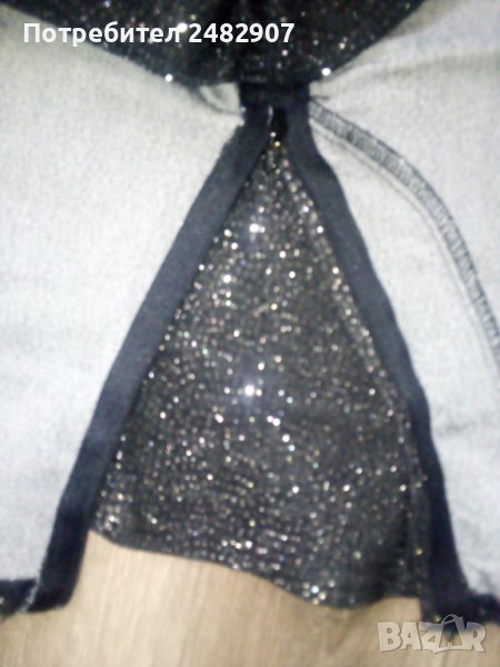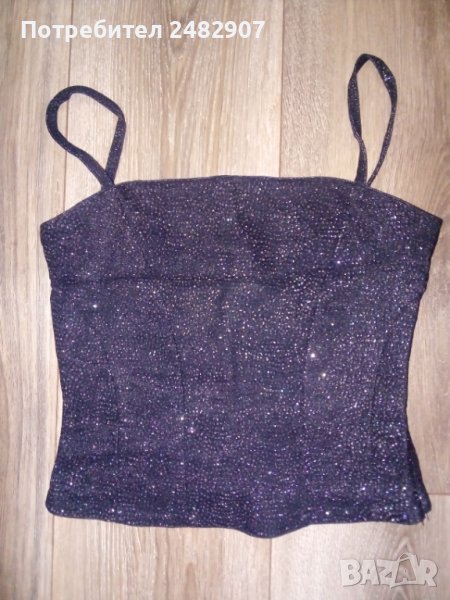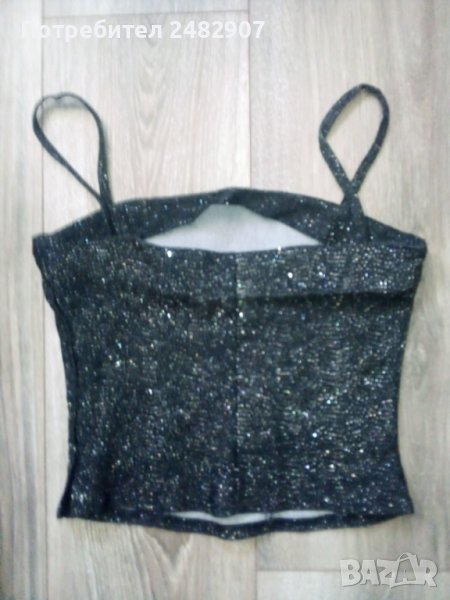 Черно дамско дънково бюстие H&M с тънки презрамки и блестящ ефект, размер 36. Съдържа 57 % вискоза, 40 % полиестер и 3 % еластан. Закопчаване - частичен страничен цип в ляво. Ширина под мишниците - 36 см, дължина от горната част на презрамката до долу - 43 см. Леко еластично, леко вталено, обличано е веднъж за повод. Отлично състояние, без забележки.