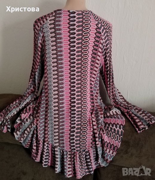 Туника с издължен гръб и волан (14 см) в долния край и на ръкавите ; в лилаво, розово, бледо синьо и черно ; с набиране по дължина отпред и декоративни пискюли. По етикет е M, но отговаря на L и XL. Материята е памук, вискоза и еластан- мека, но тежко падаща, непрозираща и нелепнеща.