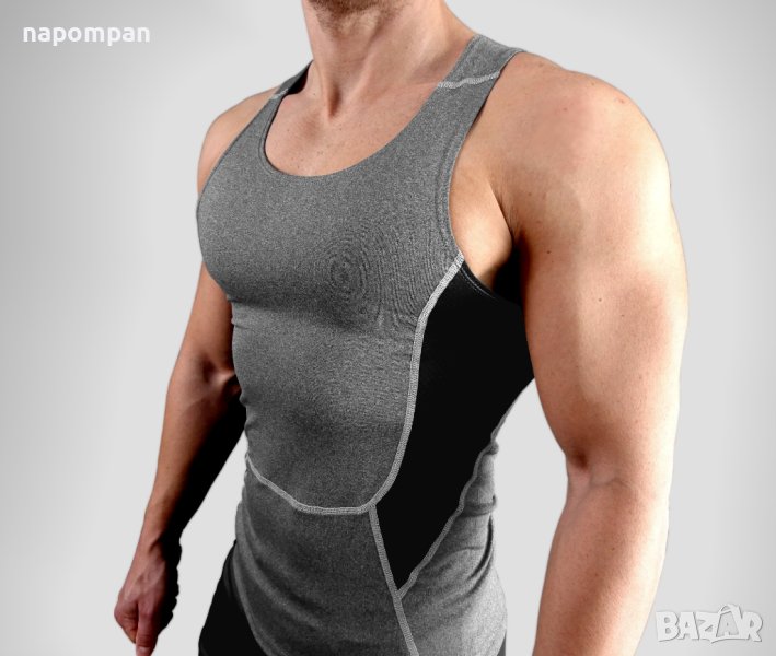 Мъжки спортен потник за фитнес и ежедневна употреба. Разтегателна материя с мрежест плат под мишниците против изпотяване. Потникът стои по тялото и подчертава физиката.