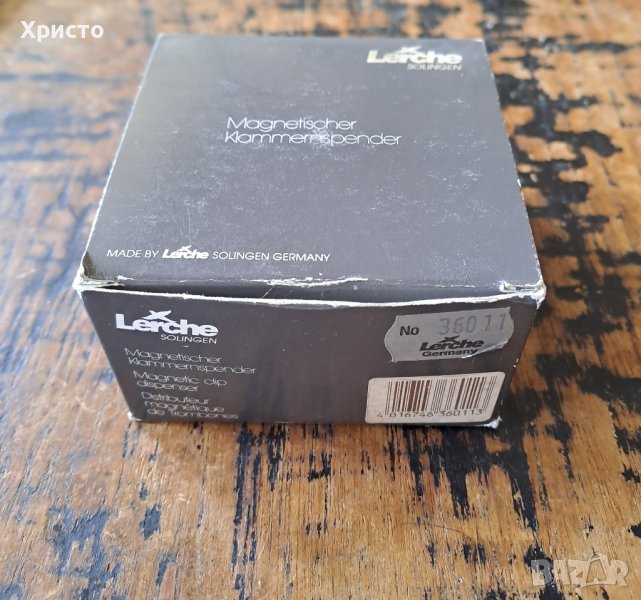 Продавам кламерник магнитен Лерхе Lerche Солинген Solingen, метален и стабилен, черен мат. Модел № 36011. Произведено в Германия. Размер: горен диаметър 8 см, диаметър на основата 8,8 см и 4,6 см височина. Тежи с кутията 355гр. В оригиналната кутия, която е леко амортизирана. Не е ползван. Уникат, от частна колекция. За ценители.