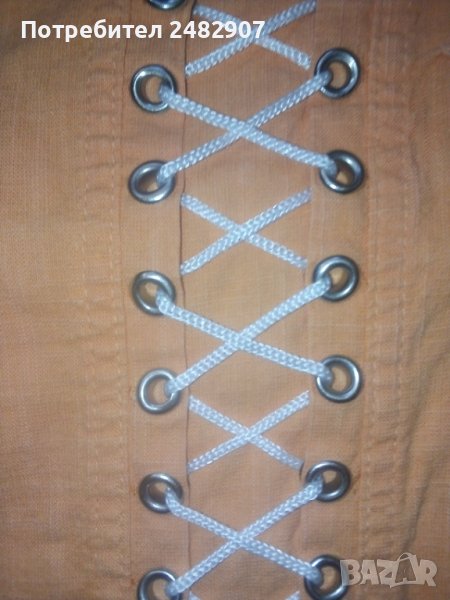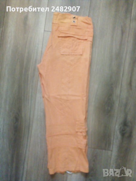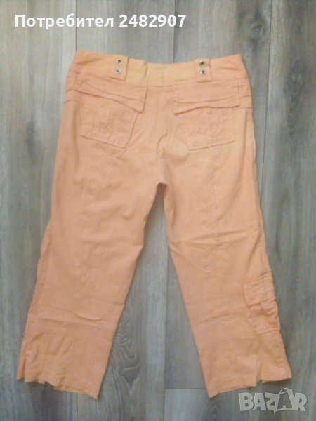 Ефектен дамски панталон - 7/8 в оранжево, размер 42. Ширина в талията - 36 см, дължина от талията до чатала - 20 см, дължина от талията до долу - 70 см, ширина на крачола в долната част - 20 см. Запазен, с нормални следи от износване и частично обезценяване, видимо от снимките.