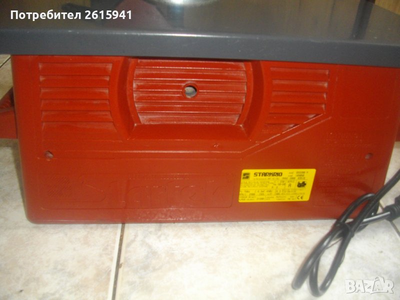 Производство маркирано на машината - 2000 г - Startek Utensili Elettrict by STARKRIO - ITALY 2000. Предни 2 пускови бутона със силиконово антипрахово покритие. Метален плот голям с размери 500 х 400 мм. Разграфен от двете страни по ширина до 15 см. 2 странични дръжки от твърда пластмаса за удобно носене - дръжките са еднокомпонетни с корпуса /изляти заедно с него/. Корпус - пластмаса. Капак над диска. Конектор външен на отпадъчна прах за директно скачване в стройтелна прахосмукачка или торба за прах. Височина на машината с диска и капака . 350 мм. Тегло - 10,0 кг.