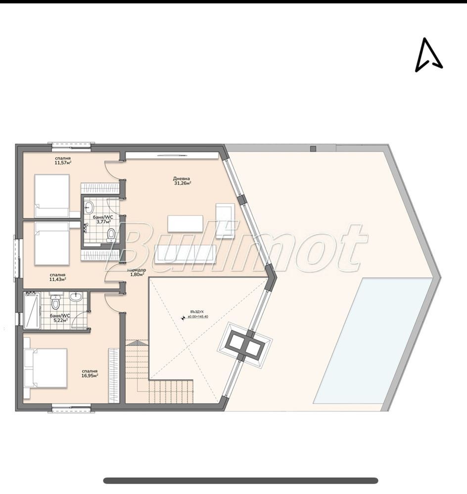 Къщата е с РЗП 430 кв.м, на два етажа със следното разпределение: