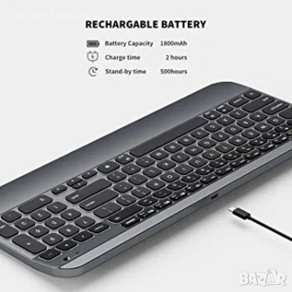 USB-C акумулаторна клавиатура: С вградена литиева батерия Bluetooth клавиатурата с подсветка може лесно да се презарежда чрез включения Type-C кабел. Пълното зареждане ще издържи 1 месец в режим на готовност