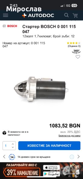 Стартер Bosch 0 001 115 047 / Mercedes Benz