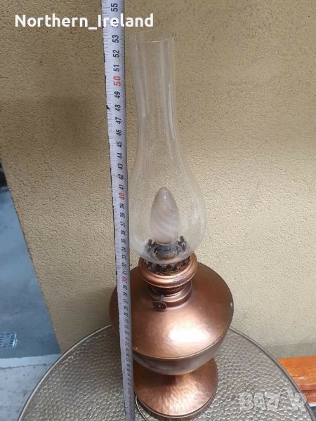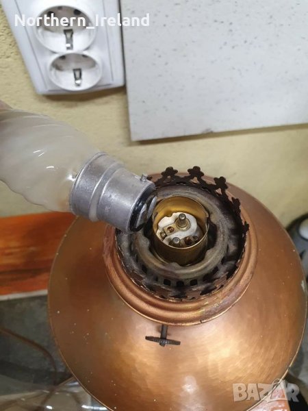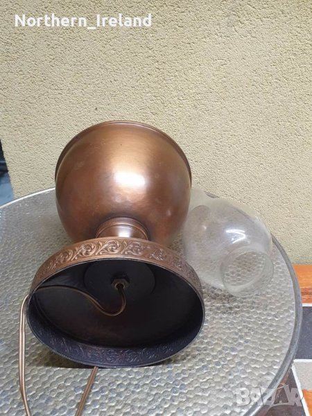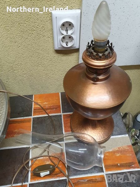 Ретро Медна/бакърена настолна електрическа лампа ,височина със стъкленото шише 53см без него 30см основа,крушката е някаква странна и е изгоряла-цена 60лв