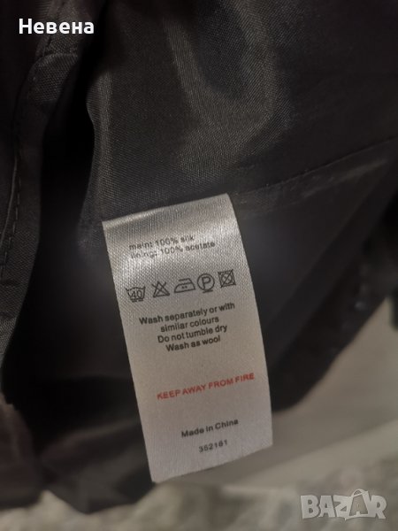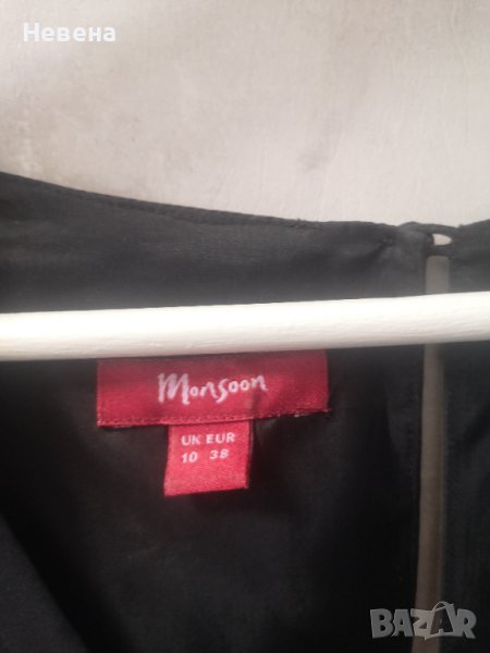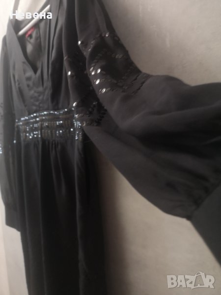 Прекрасна елегантна официална Рокля от естествена коприна на марката Monsoon. Ръкавите са копринен шифон, тип буфан, деликатно декорирани с черни пайети, като тези на колана на роклята. Дължина скриваща коленете. Размер L, Може и М, ако дамата желае да пада по свободно. Кройка та е класическа, елегантна и чудесно оформя фигурата. Удоволствието да се носи естествена коприна е голямо.
