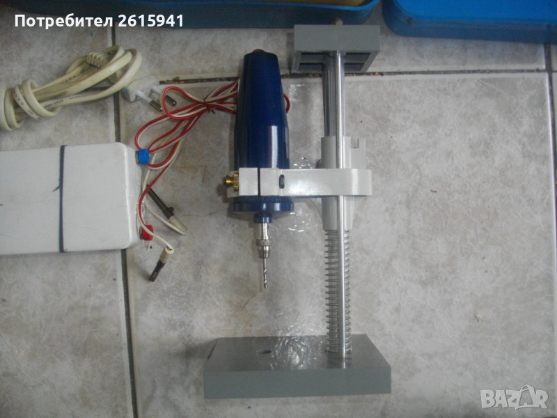 ОПИСАНИЕ на ел.мини дрелка-шлифовалка-прав шлайф 259 лв. Машината е за работа в трудно достпъни места и при работа с миниатюрни детайли. Липсва стикера с марка модел на комплекта. Предполагам холандско/нидерландско произовдстно на KINZO. Комплекта е професионален, от старото здраво и качествено произовдство от преди години. Машината работи на 15 волта чрез захранване от 220 волта стандартно. Наличен трансформатор 15 волта-220 волта, 2,0 ампера. Дължина на машината шлифовалка прав шлайф - 120 мм, диаметър 30мм-60 мм. Налична е оригиналната стойка към машината, с регулация на височина и ход. Височина на стойката - 210 мм, работен ход - около 10 см, в зависивост на каква височина е поставен стопера на стойката. Пластмасова основа и глава на стойката, алуминиева тръба. Корпус на машината - твърда пластмаса с ключ за изключване. Аксесоари в комплекта - общо 45 броя, от които 3 бр. различни цанги /до 4 мм/, видирани свредла и бургии, шлифовалки, зачиствачки и други остриета миниатюрни размери.