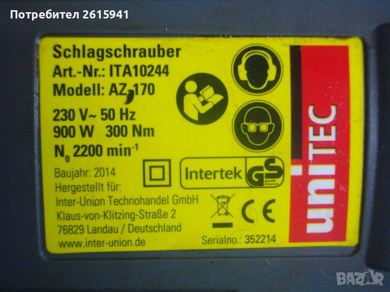 ОПИСАНИЕ на ел. гайковерт - 299 лв. Немски оригинален старо качество. Професионален . Марка и модел - UNITEC Modell AZ 170. Мощност- 900W. Сила на натягане - 300Nm. Производство - немско оригинално 2014 г. - Deutschland. Производител -Union Technolander GbmH. Скорост - 2200 об/мин. Квардарт захват отпред със съчма, размер 1/2 цол /15 мм/. Стоманен редуктор на корпуса. Реверс смяна посока на спусъка. Гайковерта е почти нов, със съвсем бегли и трудно забележими следи от употреба. Отлично техническо/работно състояние. Без забележки. Към него в комплекта има 4 бр. камъни торсове накрайници от хром-ванадиум, размери: 22 мм, 21 мм, 19 мм, 17 мм.