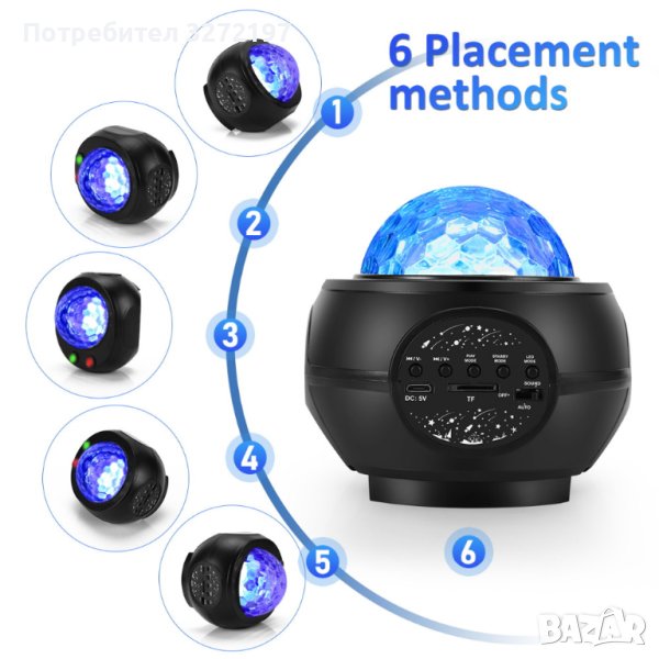 * Нашата диско топка може да бъде поставена от различни ъгли, използвайте различни разположения в различни среди, за да покажете най-добрите светлинни ефекти, така че няма да бъде ограничена от пространство, можете да се насладите на фантастичното изживяване на осветление във всяка среда. 360 въртяща се динамична проекция върху постоянно променящата се синя мъглявина. Уникален начин да осветите партито, да възстановите работното пространство или романтична вечеря за двама. Можете да свържете Bluetooth устройство, за да възпроизвеждате музика. Това са не само диско светлини, но и нощни светлини и Bluetooth високоговорители. Подаръци за възрастни и деца!