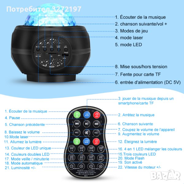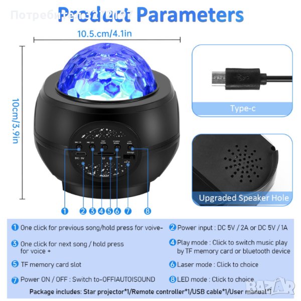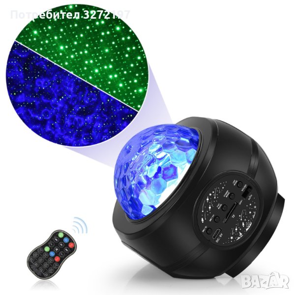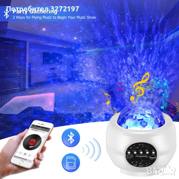 Висококачествен музикален звезден проектор с реалистично звездно небе създава романтична атмосфера за вас и вашите деца. С високоговорител с bluetooth, вълнообразен проектор с висока разделителна способност и дистанционно управление, звездният проектор може да прожектира звездното небе изцяло върху стената и тавана. интелигентно дистанционно управление, можете свободно да контролирате включването/изключването на морските вълни и звездните светлини, да регулирате яркостта, да променяте режима на осветление, музикалния режим, силата на звука и да ви позволи да изберете желания режим.