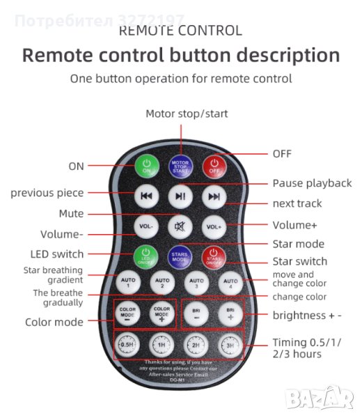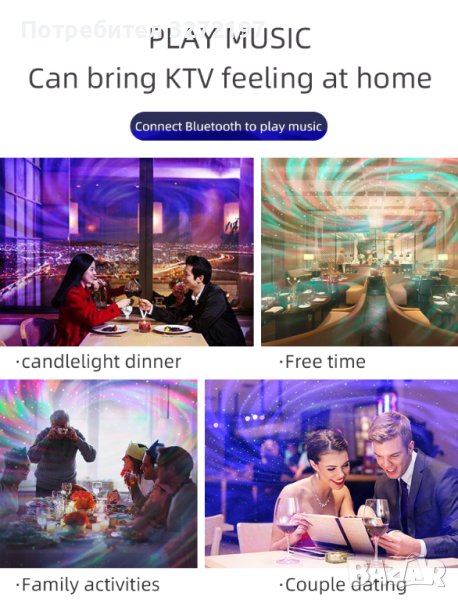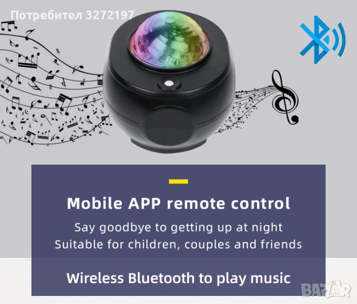 Поддръжка за свързване на проектора към вашия телефон чрез Bluetooth, за да възпроизвеждате любимата си музика. Висококачествената музика и ефектът на галактика черна дупка създават романтична и успокояваща атмосфера в нощната стая. Регулируем обем.