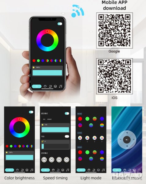 Управлението на интелигентното приложение е удобно за нашите потребители. Винаги можете да контролирате светлината чрез вашия смарт телефон вместо дистанционно управление, чрез APP, за да регулирате цветовете, яркостта, скоростта на въртене на галактиката, наситеността на цветовете и светлинните ефекти, за да зададете любимия си режим на осветление.