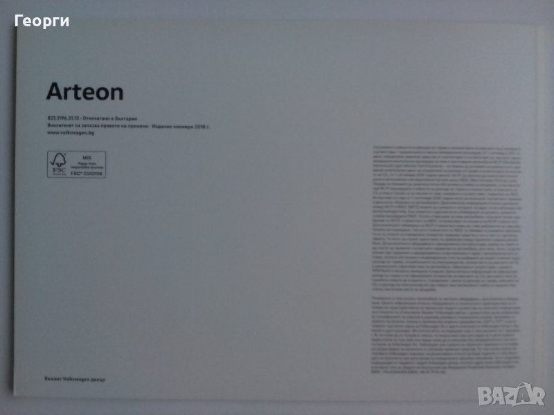 Продава се оригинална брошура (каталог) за Volkswagen Arteon от 2018 г. на български език с 56 страници и меки корици. В много добро състояние, без липсващи, надраскани или скъсани страници. От дом на непушачи - брошурата не е задимена с неприятни миризми.