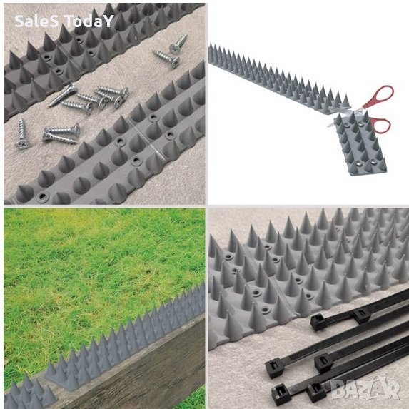 Пръчки, изработени от здрава пластмаса с 2 см шипове, които са изрязани, за да паснат на повърхността, върху която искате да ги поставите. Изработен от гъвкав материал, който може да се използва и да пасва лесно на извити части, той може да се използва за замяна на телена мрежа. Всеки прът има няколко отвора за винтове, пирони, лепило или кабелни връзки за лесен монтаж върху равна или извита повърхност. Не причинява вреда или нараняване на животни и хора, докато специалният дизайн от висококачествена издръжлива полипропиленова пластмаса гарантира добър живот.Поставете ги на первази, веранди, климатици, огради, покриви или навеси. Те ефективно предотвратяват навлизането на птици и животни в района. Устойчив е на слънчева светлина и UV радиация.