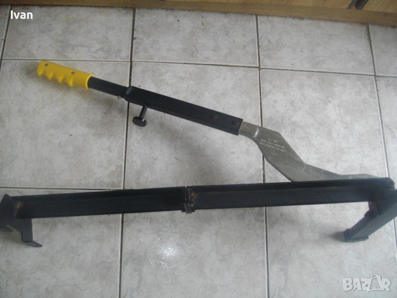 ОПИСАНИЕ на черна лостова нова австрийска гилотина за рязане на ламинат - 159 лв. Съвсем нова голяма, масивна ръчна машина за рязане на ламиниран паркет. Работата посредством подобна машина е бърза, лесна, професионална и без запрашване на помещението, като срезовете са чисти, гладки и без нащърбвания.