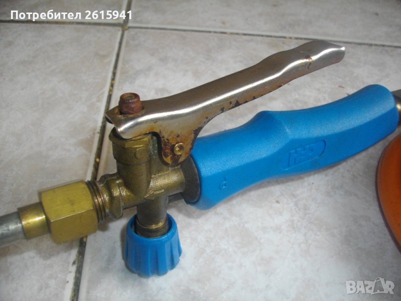 ОПИСАНИЕ на почти нова горелка за покриви 850 мм с маркуч 5 м. - 139 лв. Марка на горелката - CFH. Почти нова, ползвана веднъж, в отлично техническо/работно състояние. Дължина на горелката - 85 см, бронз глава и бронз спирателен кран/върток с червена пластмосаво покритие врътка. Стоманен спусък. Поставена оригинална стойка за самостоятелен стоежн - стоманена. Накрайник отпред размер ф 70 мм, с 1 дупка за газта и 6 дупки за пламъка. Маркуч - отличен, оригинален, почти нов, без забележки, с дължина 5 мм. Присъединителна резба отзад на маркуча - универсална.