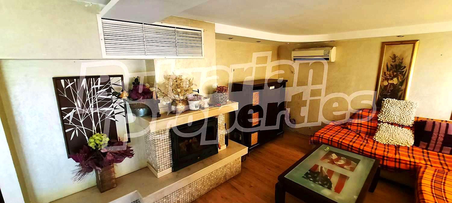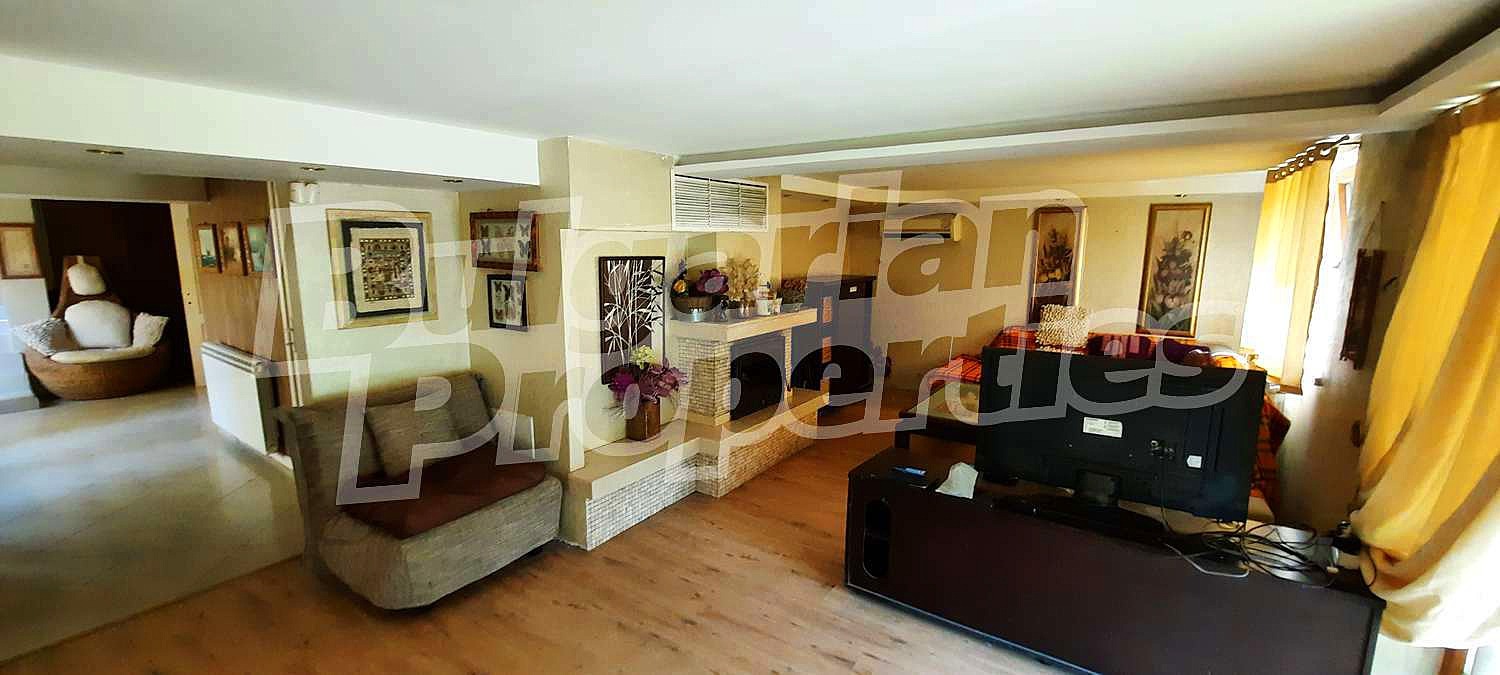 Първи етаж - просторна дневна с хол, трапезария и камина, кухня, веранда, санитарен възел и килер с дрешник;