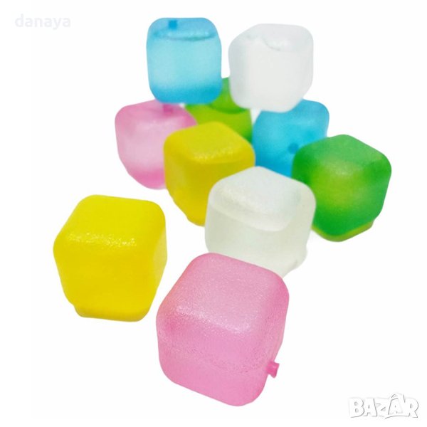 Комплект от 10 броя цветни кубчета за лед във формата на квадрат. Кубчетата са пластмасови и са подходящи за многoкратна употреба. Просто поставете във фризера, за да замръзнат. Не се топят, както истинското кубче лед и така напитката ви няма да се разрежда. Придават свеж цветен ефект в чашата и задържат питието студено.