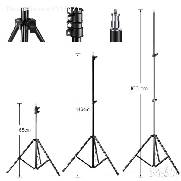 Стойката за осветление е изработена от първокласна алуминиева сплав и може да се простира от 68-160 см
