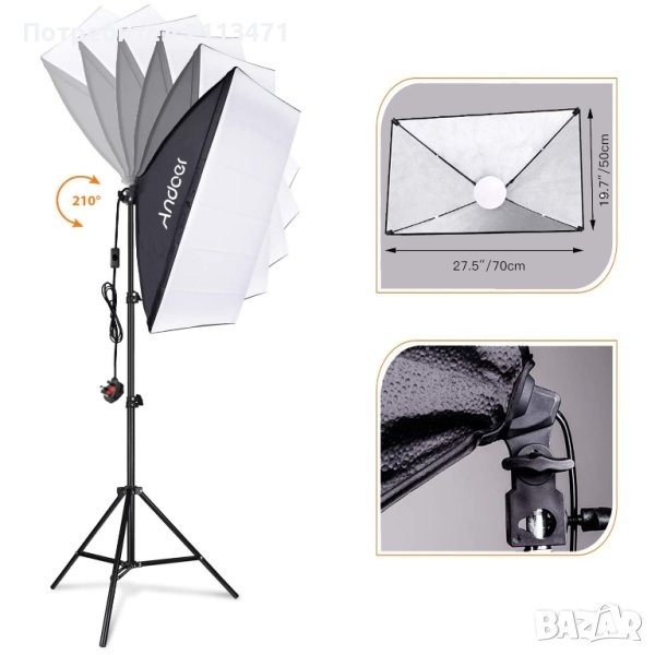 50 * 70 см голям софтбокс с бял дифузер ви осигурява идеално равномерно осветление; с цокъл Е27 за директен монтаж на LED осветител; и софтбоксът може да се върти на 210°, за да имате оптимални ъгли на светлина, което прави вашите снимки и видеоклипове по-професионални.