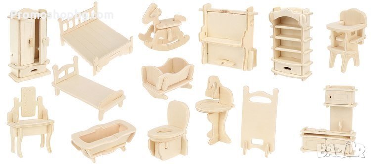 Мебелите се предлагат под формата на дървени 3D пъзели. При желание може да се използва и лепило за дърво.