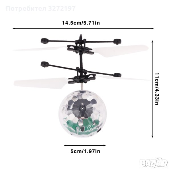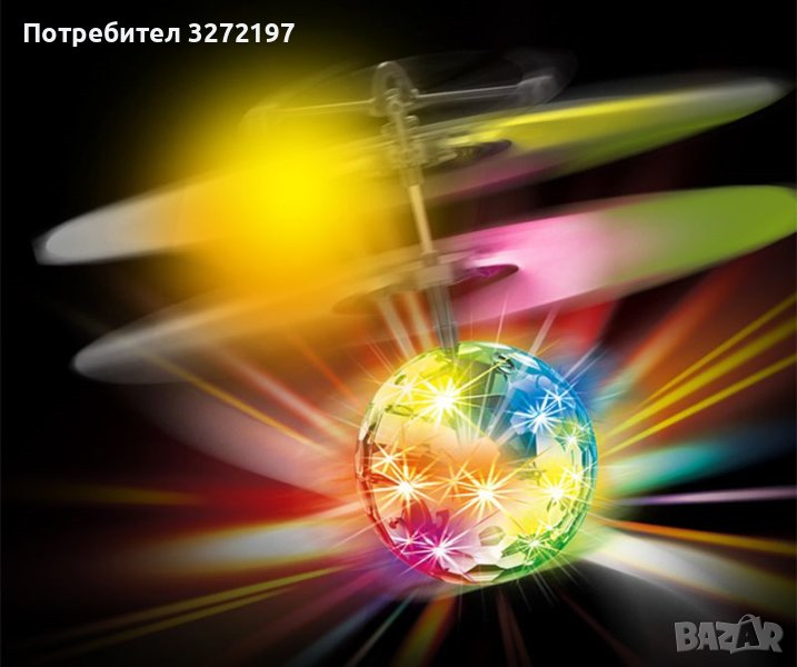 Той е като играчка хеликоптер, но вместо обичайната кабина и корпус на хеликоптера, той разполага с прозрачна стъклена топка. Когато го включите, той ще излъчва блестяща светлина, много красиво!
