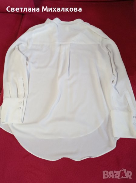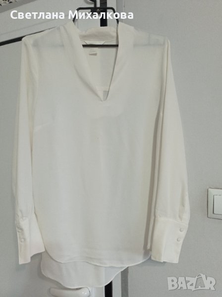 Продавам дамска копринена блуза с дълъг ръкав, бяла на цвят, раменете 40 см, гръдната обиколка едностранно 50см, дължина на ръкава 58см, дължина на блузата 63см