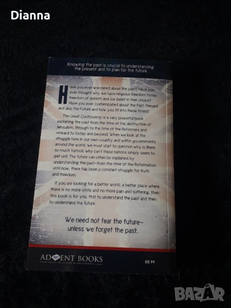 Книгата "The Great Controversy: Past, Present, Future" от Ellen Gould White, е закупена от Англия, но никога не е разлиствана. Състоянието е неразличимо от ново, поради тази причина съм отбелязала "отлично".