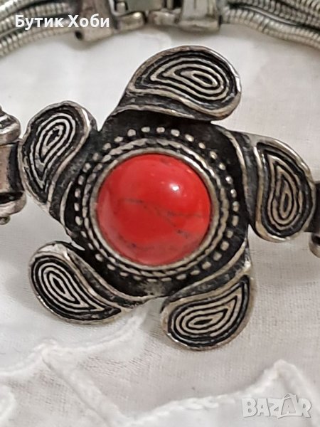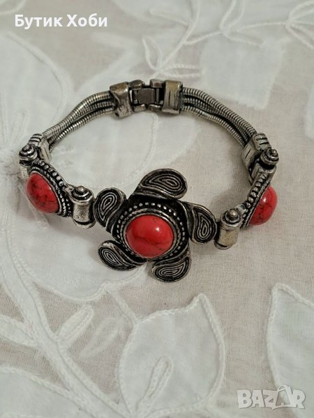 Атрактивна гривна с коралови кабошони. Плътна метална сплав, детайлна изработка, забележима и ярка тази гривна ще допълни визията ви ! Мисля, че корала е имитационен, но има и вероятност да е истинският . Дължина - 18,5см.