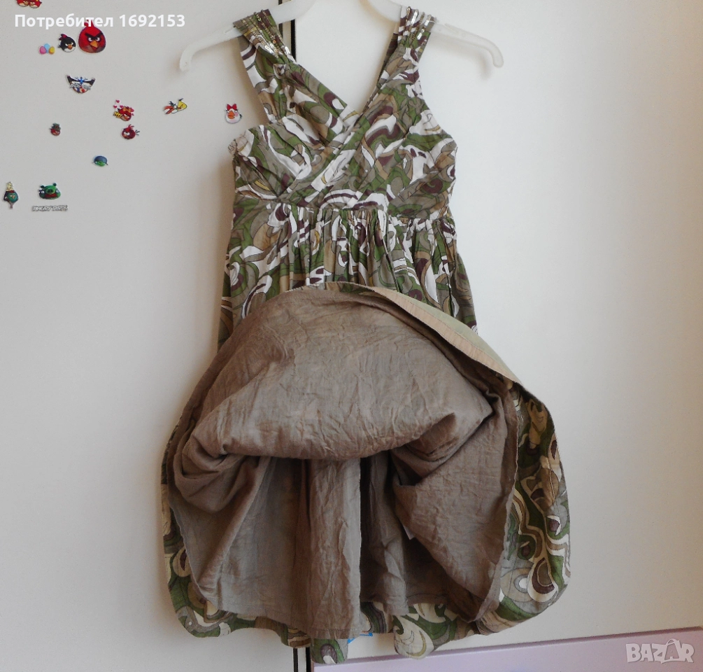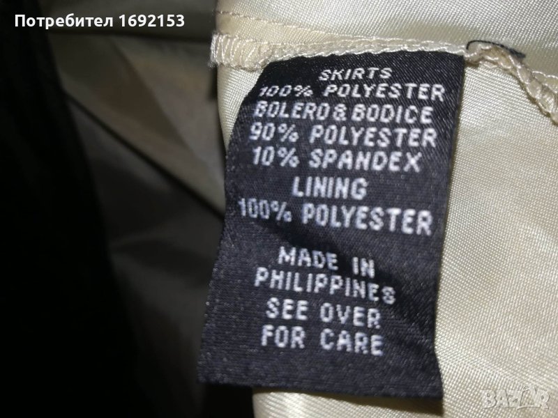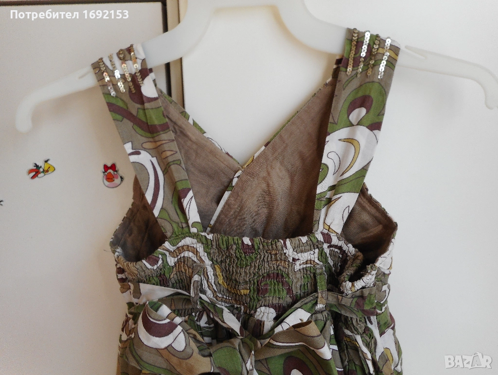 На гърба е с ластици и има допълнителен колан за завързване. На презрамките и в долната част на полата е с пайети, създаващи ефект на проблясване и придаващи елегантност. Има памучна подплата, благодарение на която роклята стои по-клоширана и не полепва, когато се носи с чоропогащник. Стои много хубаво.