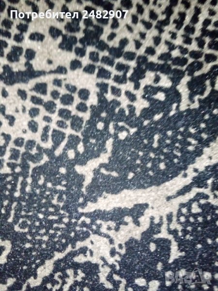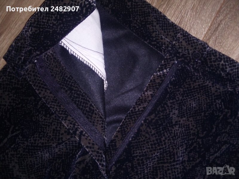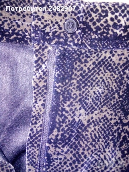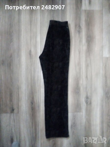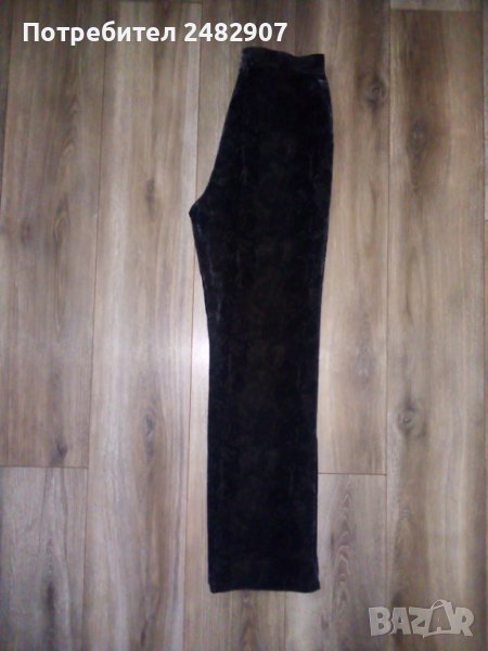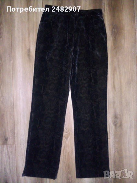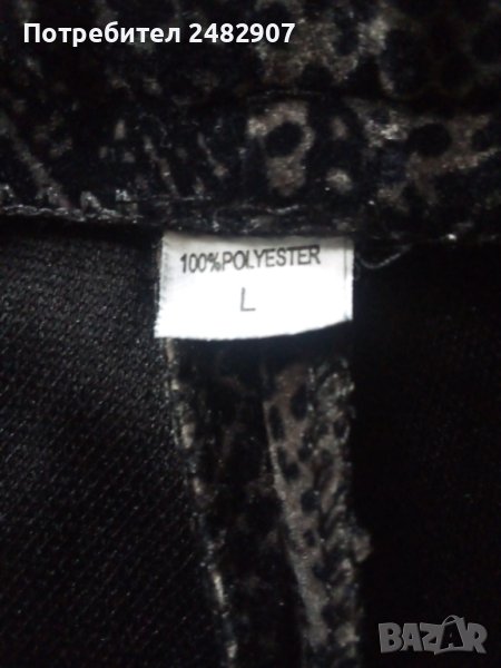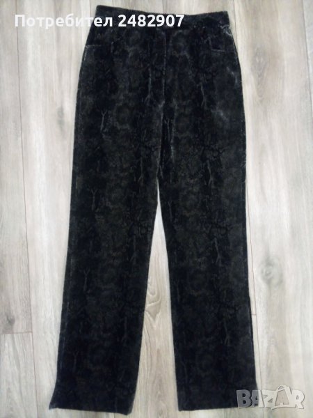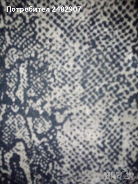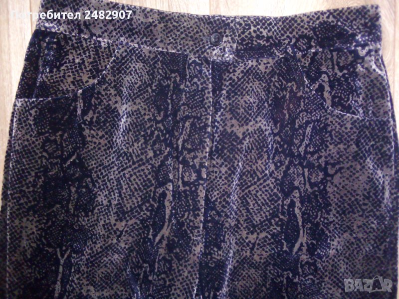 Дамски плюшен панталон със змийски принт, размер L. Съдържа 100 % полиестер, с два джоба отпред и закопчаване с цип и копче в предната част. Ширина в талията - 36 см, дължина от талията до чатала - 33 см, дължина от талията до долу - 105 см, ширина в долната част на крачола - 21 см. Чисто нов, не е използван, с малки цепки в долната странична част на крачолите.