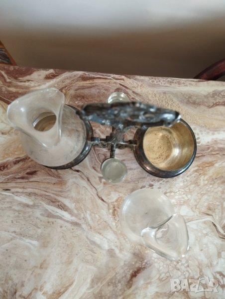 посребрен оливерник арт деко.маркировка на дъното.висок е 27см,широк 21см,отвори 6.8см.стъклениците са високи 17см.внос от франция.