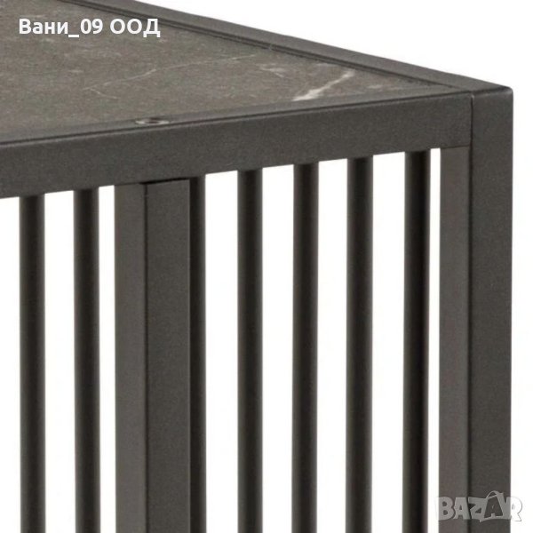 Модерна помощна маса в индустриален стил с размери Ш:35/Д:43/В:63 см. Притежава характерен дизайнерски почерк, по отношение на нетипична метална конструкция с овални вертикални метални пръти, подредени по цялата ширина на гърба на масата, както и красива мраморна текстура на плота. Конструкцията е прахово боядисана в черен цвят, като в основата е с протектори щадящи пода, а плотът е достатъчно голям за поставянето на лаптоп и чашата с кафе. Със своята олекотена конструкция масата може да бъде лесно местена, а поради компактните си размери може да бъде поставена почти навсякъде. Моделът чудесно би стоял до фотьойла, като по този начин, чашата с кафе винаги ще е на една ръка разстояние.