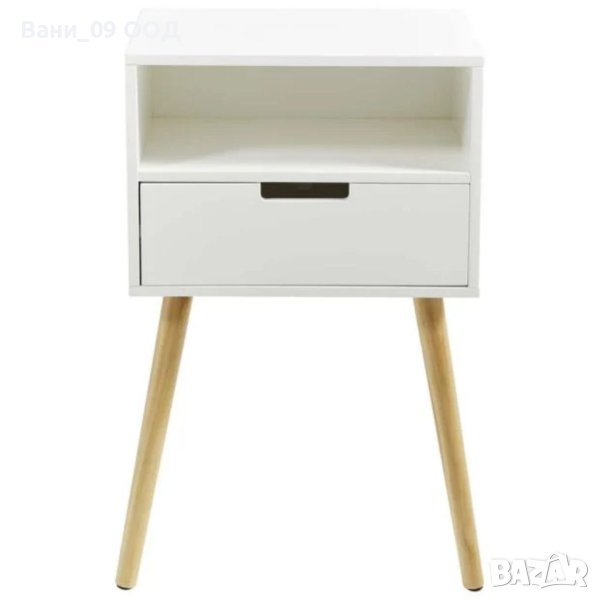 Помощна масичка с размери Ш:40/Д:30/В:63.5 см. Моделът разполага с корпус в бял цвят с една отворена ниша и чекмедже за съхранението на малки предмети и лични вещи. Артикулът е поставен на четири овални дървени крака в светъл боров декор с протектори щадящи пода.