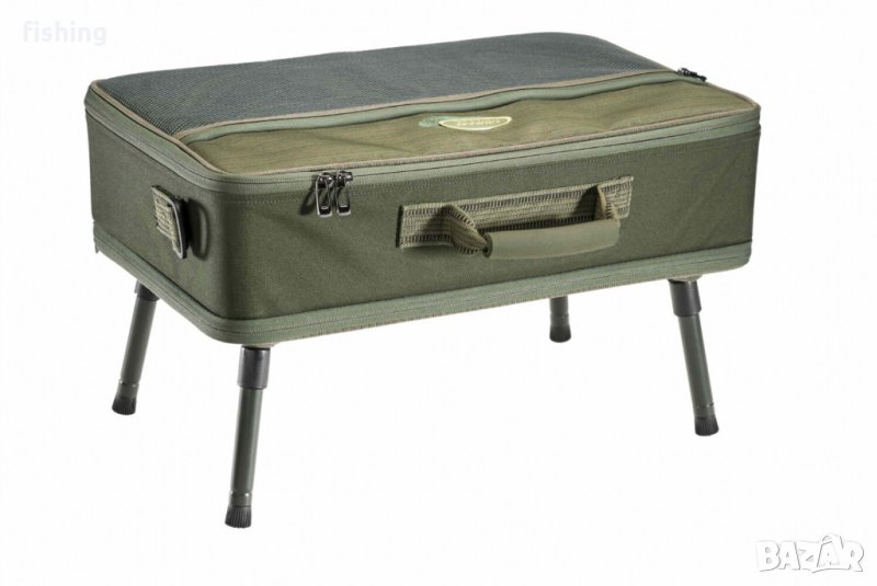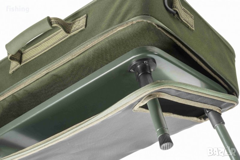 Изключително удобна, висококачествена комбинация от калъф за аксесоари и бивакова маса. Вътре ще намерите регулируеми разделители, здраво фиксирани с велкро, докато в долната част има напълно оборудвана (и разглобяема) алуминиева маса с четири регулируеми крака. Или използвайте кутията с крака, или махнете масата и я използвайте независимо. Универсална презрамка може лесно да се прикрепи към калъфа, ако е необходимо.